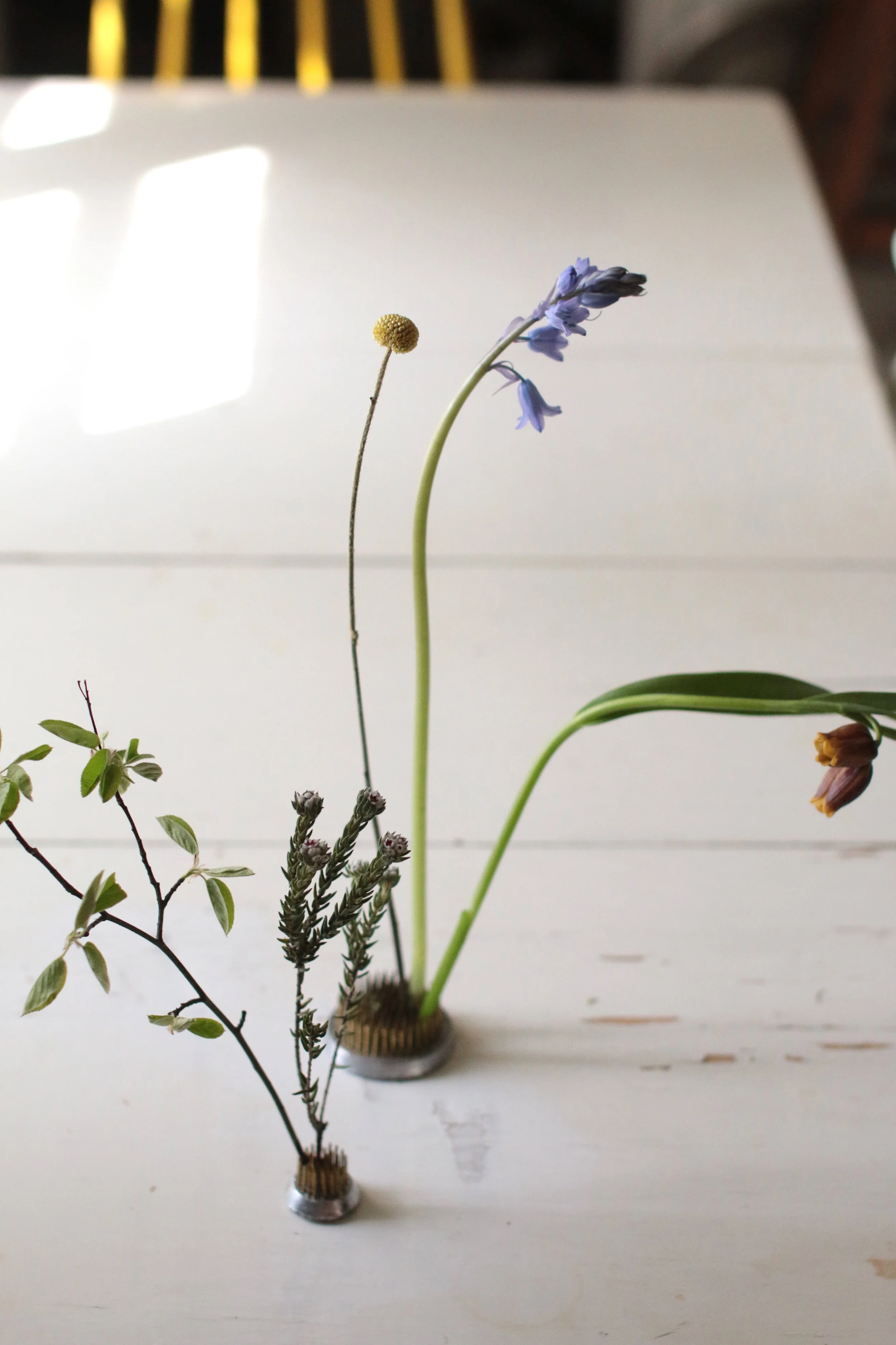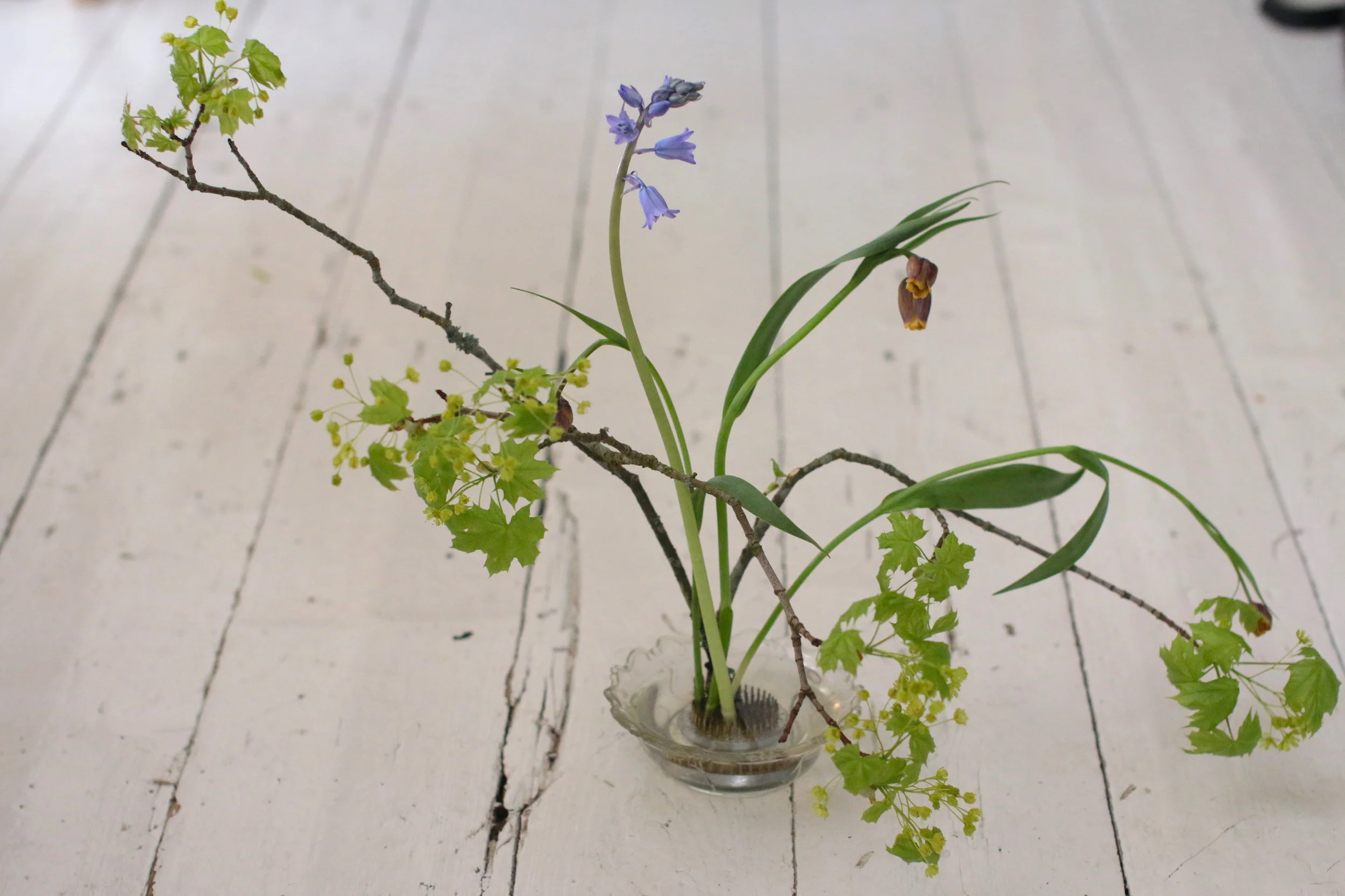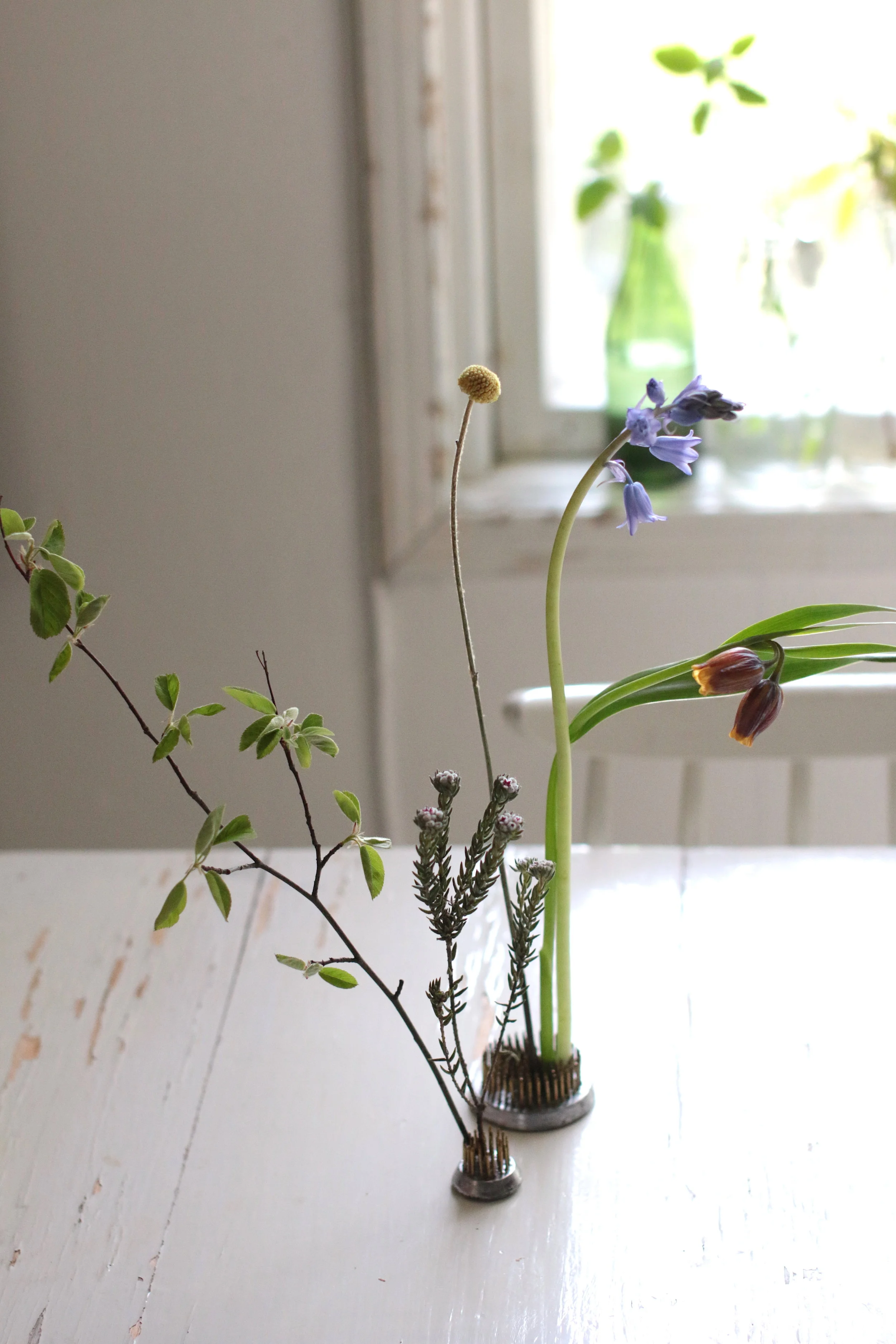 Kukkasiilin avulla on helppo asetella leikkokukkia ja luonnon käppyriä, kuivanneita oksia ikebanan hengessä.