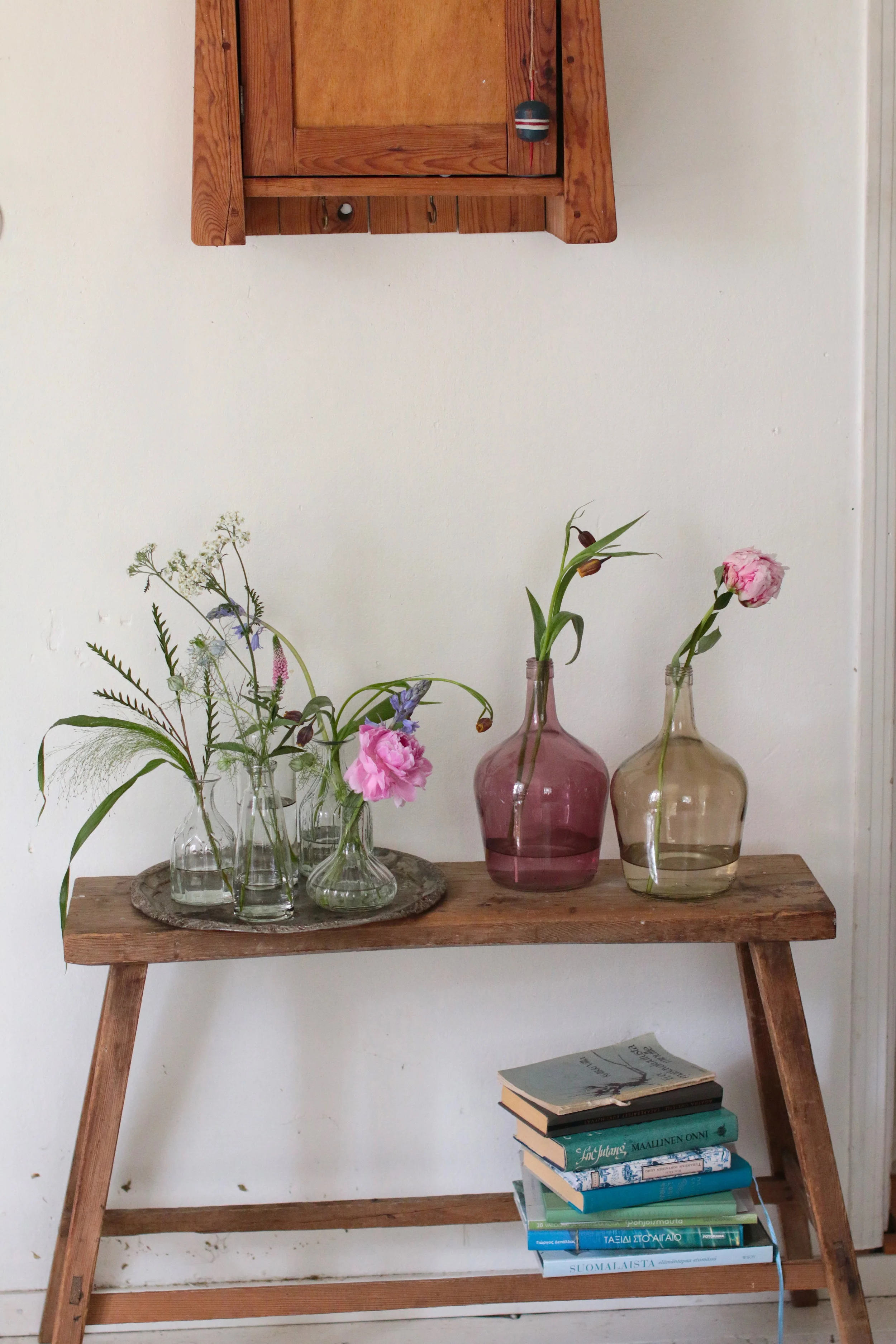 Olemme edelleen innoissamme maljakko- tai pulloryhmien muodostamista kokonaisuuksita ja asetelmista. Näillä syntyy helposti todella keveän ja kesäisen lämpimiä tunnelmia. Kuvasimme juhannuksen hengessä kesäisiä pöytäkoristeita Jänessaaressa, jolloin pehmeät värit toivat kotoisan ja rennon tunnelman.