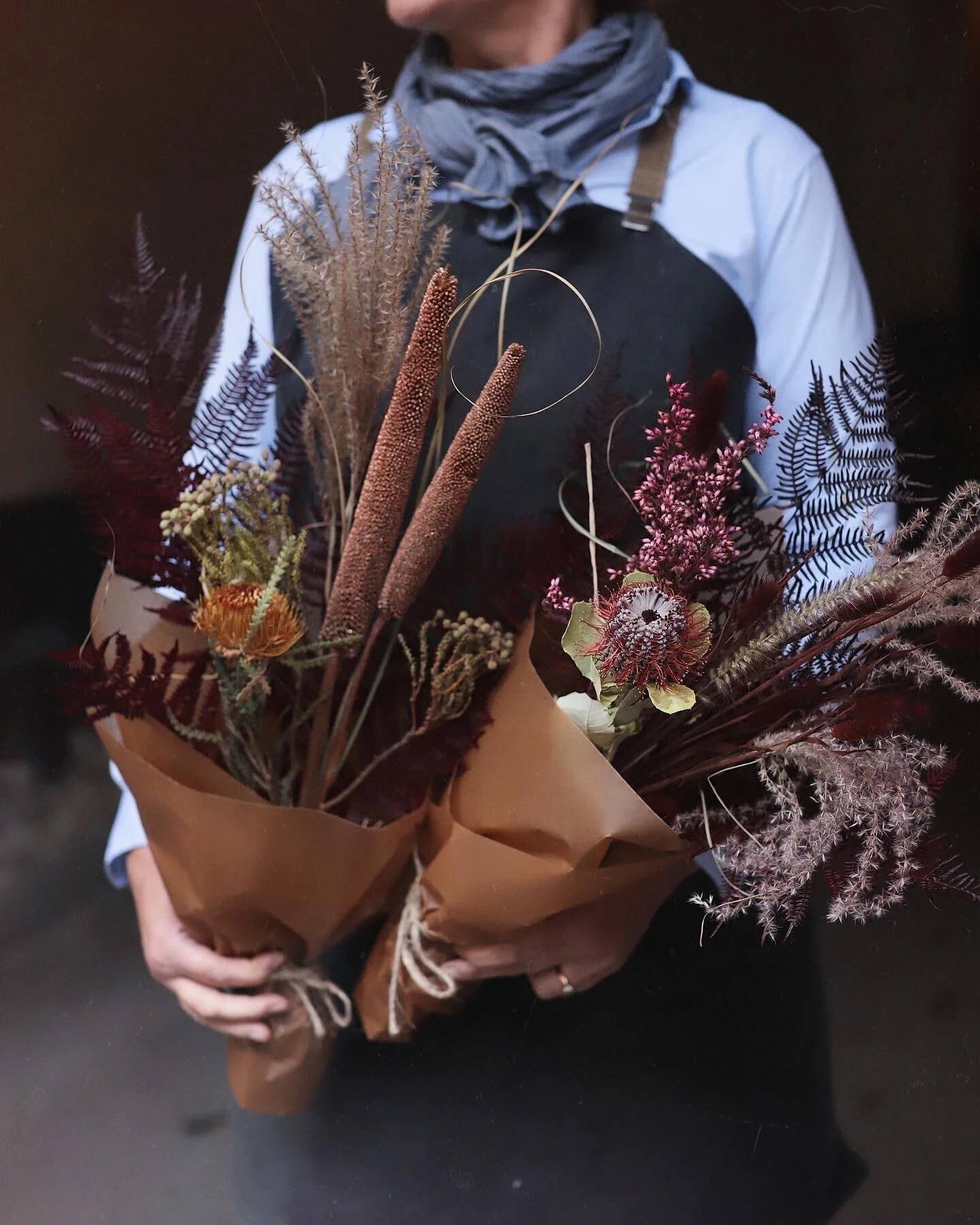Balala, elefanttiheinä, banksiat ja kuivattu ja värjätty saniainen.
