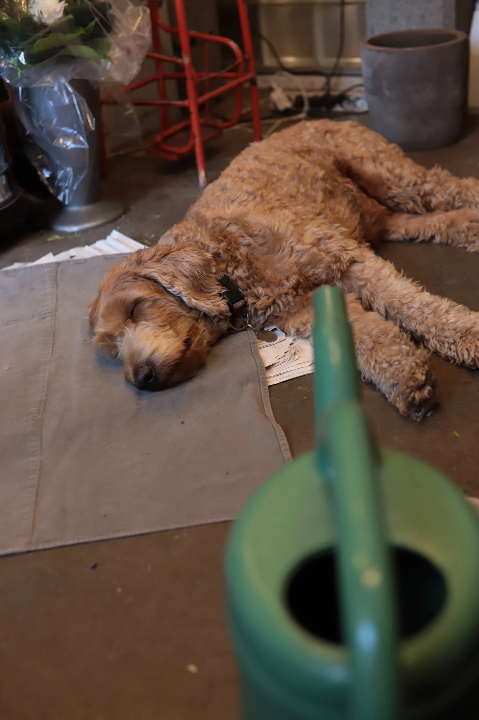 Kukkakaupan arkeen kuuluvat myös koirat :)