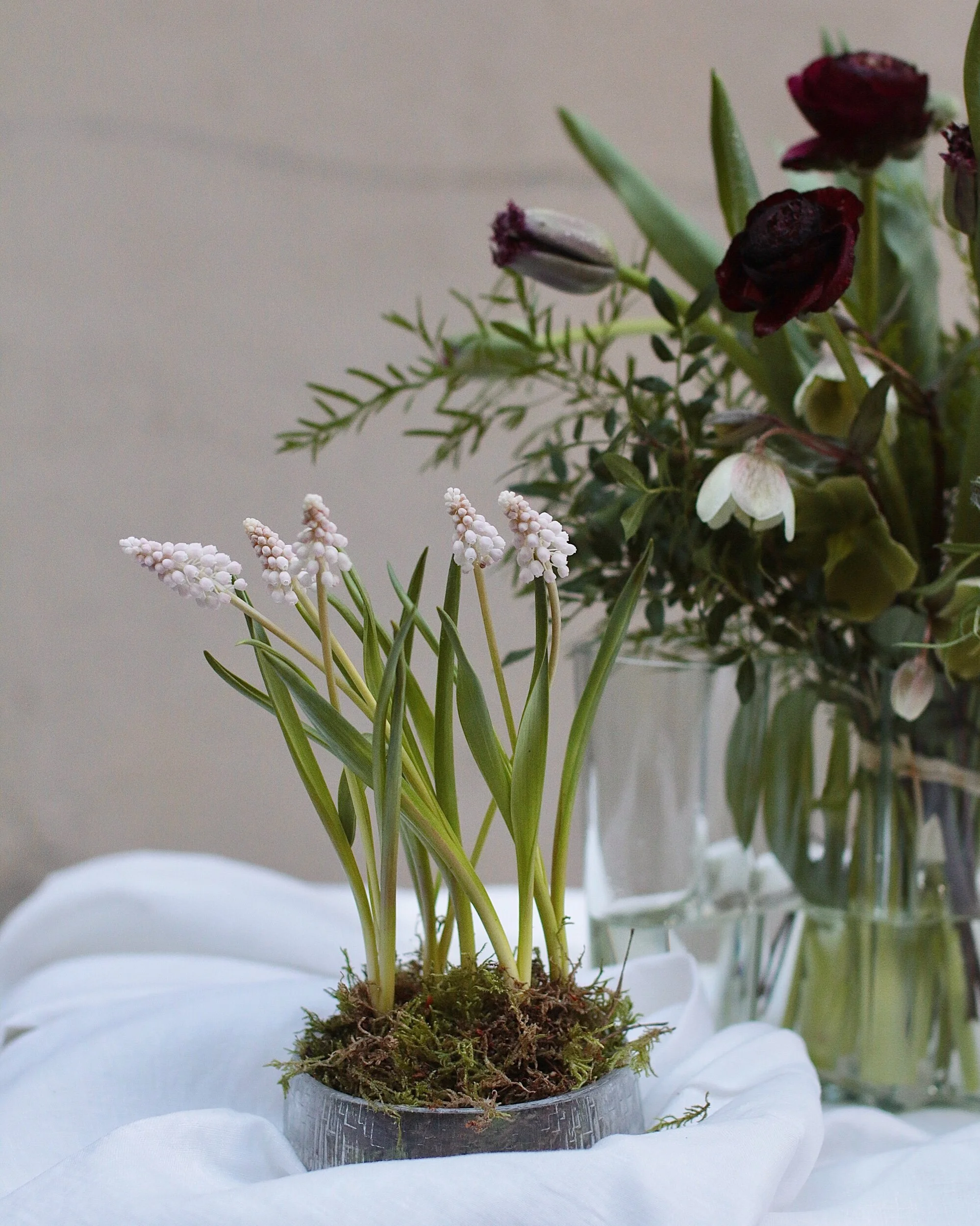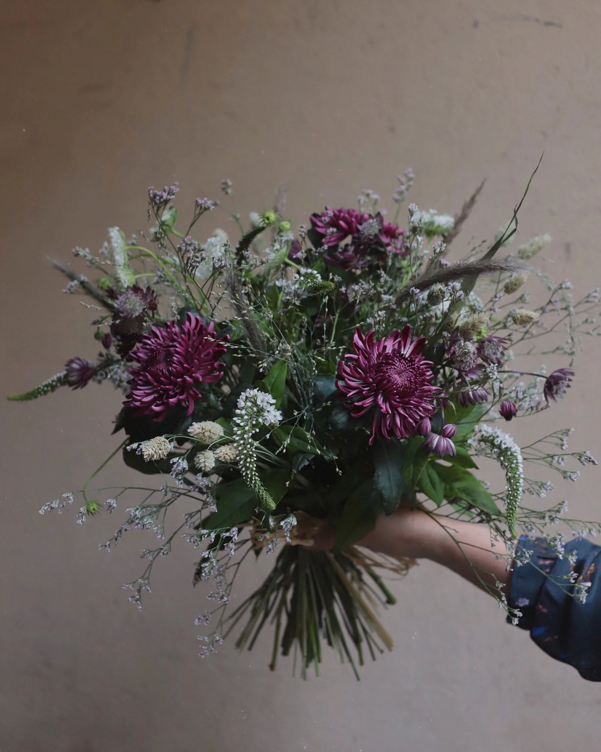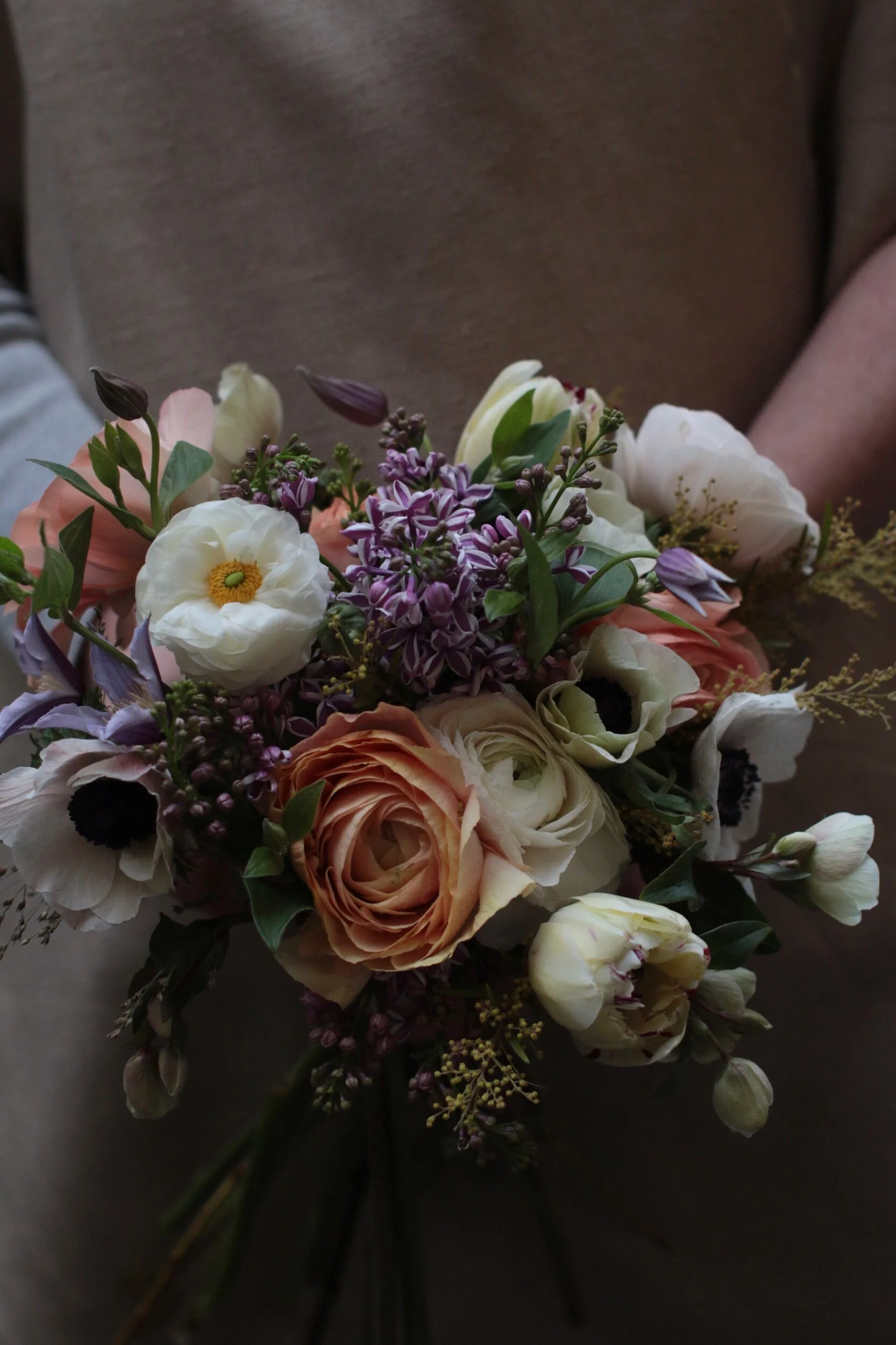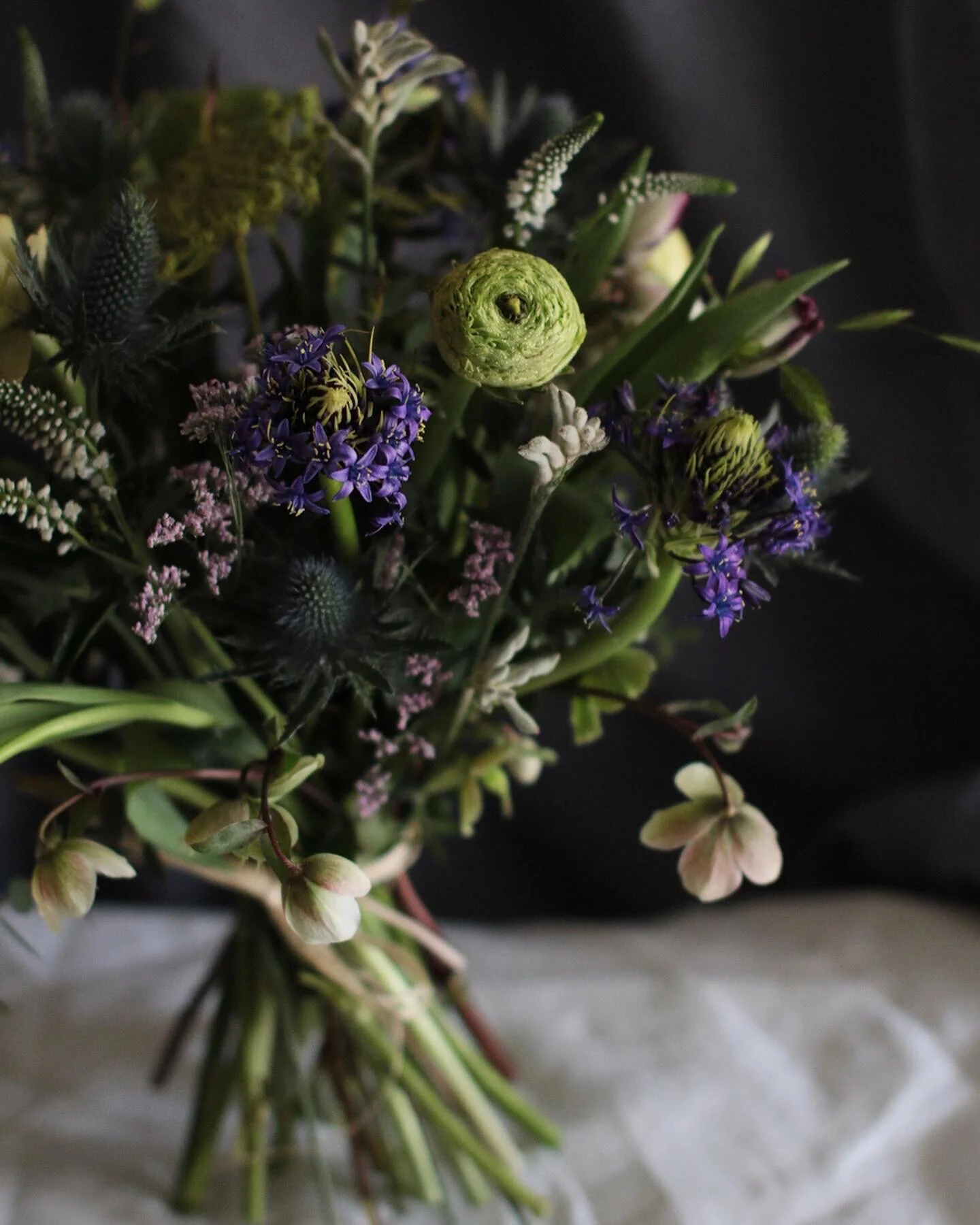 Keväisessä kimpussa on muun muassa scillaa, jaloleinikkiä, jouluruusua ja tulppaania. Tykkäämme sitoa myös tummilla sävyillä ketokimppuja.